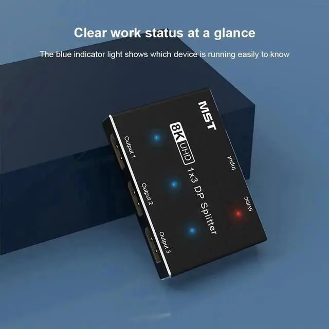 The multi-monitor splitter is of DisplayPort 1.4 Version and supports resolutions up to 8K@30Hz and 4K@144Hz (depending on features of the video source and display).