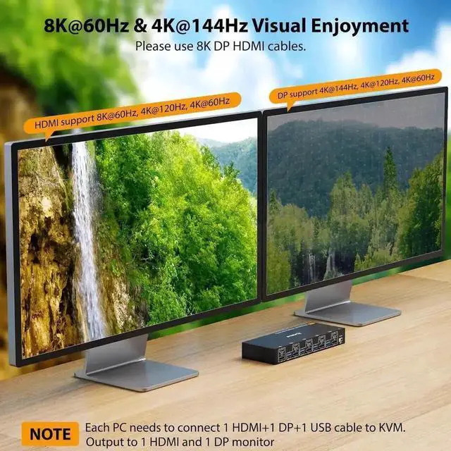 The USB 3.0 KVM switch 4 ports meets your requirements for HD videos with high refresh rate and high quality. The KVM switch 4 PCs HDMI ports supports 8K@60Hz, 4K@120Hz. 2K@165Hz. The KVM switch 4 ports Displayport ports supports 4K@144Hz, 2K@165Hz and is backward compatible. Please use HDMI 2.1 and DP 1.4 or higher quality 8K cables with KVM Switch 4 PC.
