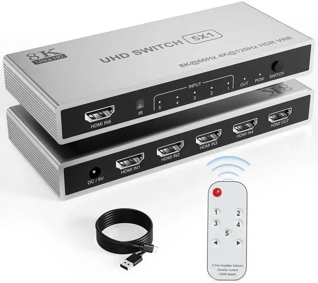 • 5 Port 8K HDMI Switch: Are you tired of constantly switching among multiple gaming devices on your TV? The HDMI Switch 5 in 1 out makes it a breeze! With 5 ports available, our HDMI Switcher allows you to connect up to 5 devices to your TV or monitor, making it ideal for households with multiple entertainment sources. Say goodbye to the hassle of constantly switching cables and enjoy the convenience of having all your devices connected at once.