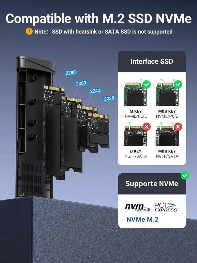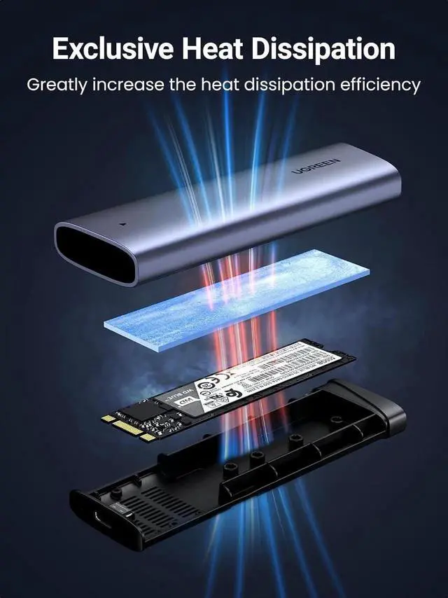Broad Compatibility: The UGREEN M.2 NVMe SSD enclosure is specially designed to support NMVe protocol M/B&M keys and for 2230/ 2242/ 2260/2280 size SSDs up to 8TB. The M.2 NVMe enclosure is applicable for Windows, Mac OS, Linux, Android, IOS systems.(Does not support SATA NGFF SSD mSATA SSD and SSD with heatsink)