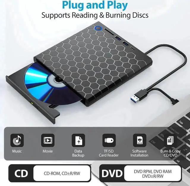 • [6 in 1 Optical Drive] with Type C ports and two USB-A ports support USB flash drive reading and also provide power to your USB interface devices. Built-in SD/TF card slot. (Note: Micro SD card adapter included).