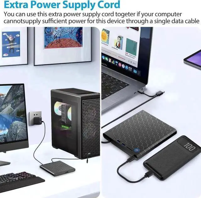 (Note: Blu format -ray is not supported). We have provided an extra USB power cable, you can connect an external power source to run it more stably when your PC or laptop does not have enough power.