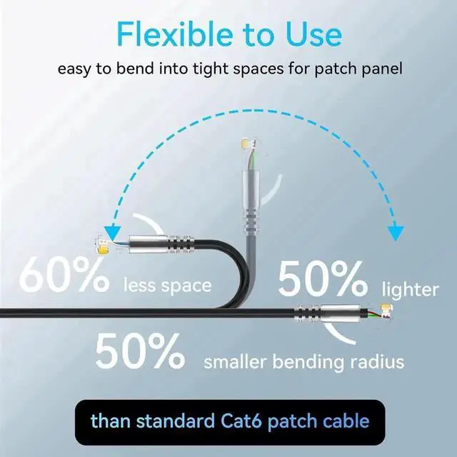 • Cat6A ethernet patch cable stands out for its slim design. Cat6 patch cables is ideal for routing in tight spaces, easy to trace specific cables and much better airflow, compaired with regular patch cables cat6.
