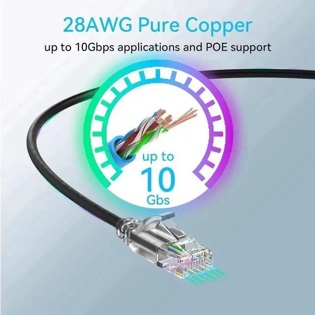 • slim cat6 patch cable is made of pure copper 28 awg and popular used in data centers and homenetwork . Network patch cables is perfectly good for data transfer up to 10 Gbps applications and POE support.