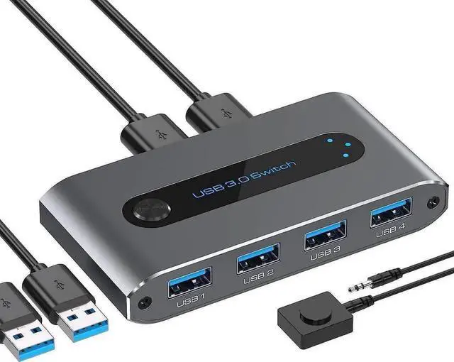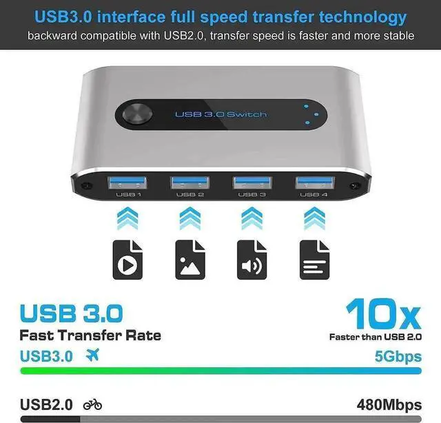 The 4-Port USB 3.0 Switch is a great option for sharing 4 USB 3.0 or USB 2.0 devices between two computers and saves time and space!The USB 3.0 switch allows up to 2 independent computers to share up to 4 USB 3.0 peripherals. This is ideal for sharing a printer or Scanners in an office environment.