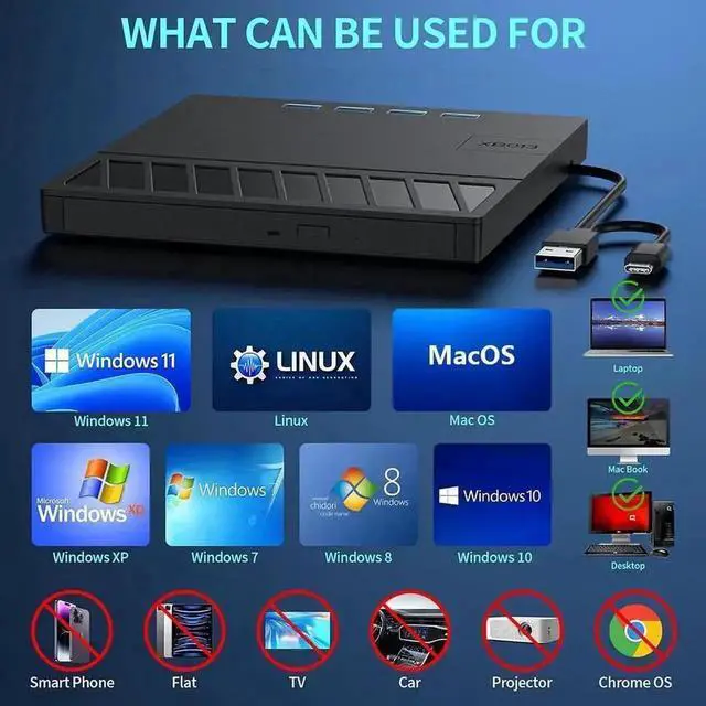This external DVD player is compatible with Windows 11/10/8/7, Linux, and Mac OS, allowing you to play CDs, watch DVDs, install software, and burn data easily across various devices. It's the ideal external CD/DVD drive for laptops, Mac-Books, and desktops