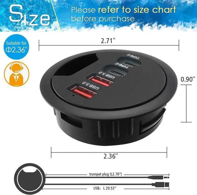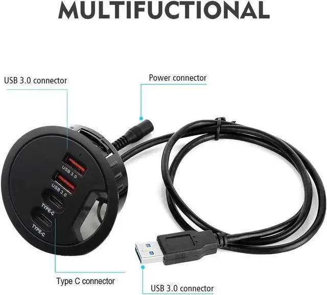 DESKTOP ORGANIZERThis compact USB hub fits inside 2.36 hole on your desk; make full use of computer desk space and solving the problem of desktop transmission. SUPERSPEED SYNCNGCircular design of the multi port USB adapter hubs up to 5Gbps it remaining backwards compatible with existing USB 1.1 / 2.0 let you transfer an HD movie in few seconds. 2 Ports Type A & 2 Ports Type CWDX USB 3.0 hub has 2 ports type A and 2 ports type C The hub adapter supports charging and data transmission max supports 5V/3A. It can connect your mouse keyboard U Disk USB Printer etc and can charge transfer data at the same time via this USB port to your devices.