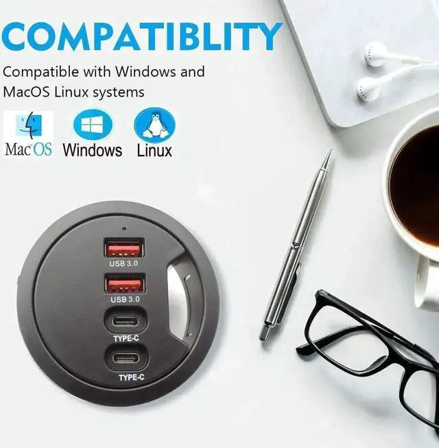 MAXIMUM COMPATIBILITYThis 4-port multi extension port USB hub compatibles with Windows 10 8.1 8 7 Vista XP Mac OS X (10. x or above) Linux. Fully plug and play no drivers required and supports hot swapping. PACKING LIST&WARRANTYWDX Desk grommet usb hub includes one USB hub cables and other installation accessories.