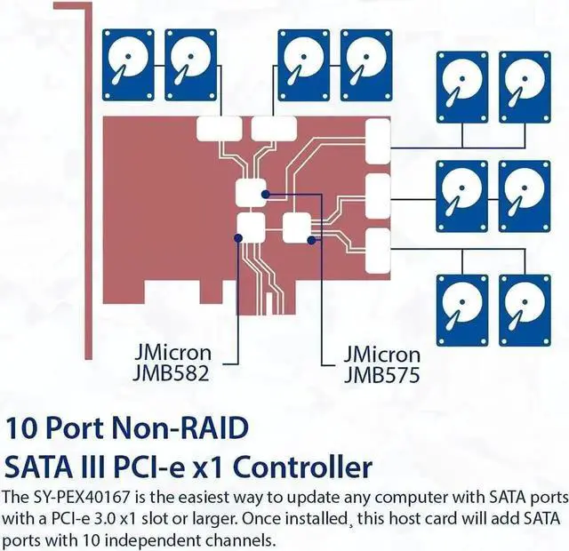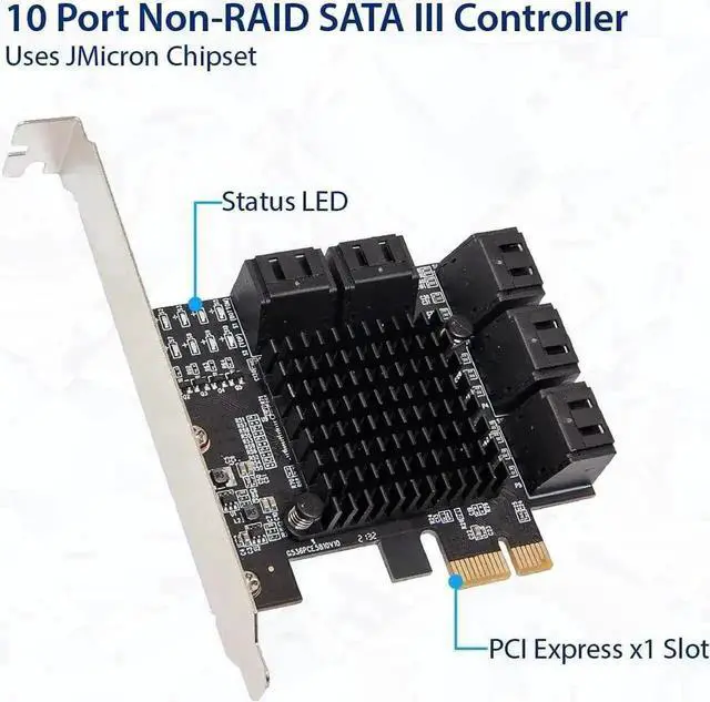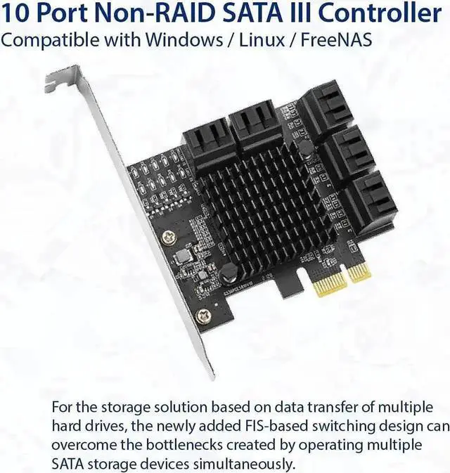 Supports 10-port 6Gb/s SATA III interface, Supports Port Multiplier, Supports Hot-Plug, Supports drive power control and staggered spin-up. Supports SATA Partial / Slumber power management state.