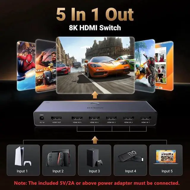 Switch Devices Easily: Effortlessly switch between devices from the comfort of your couch or bed with the remote controller (The control range is within 33 FT). You can also switch with one click via the button on the switch box. With 5 LED indicators that clearly show you which port is active. PACKAGE: 1*8K HDMI switch, 1*Power adapter, 1* Remote control, 1* User manual