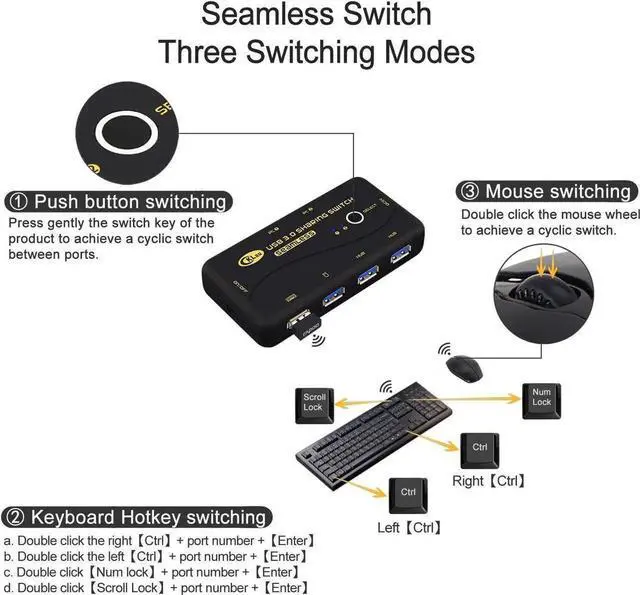 3. Mouse and keyboard will lag about 2-3seconds when connect the switch at first time, because the switch need to distinguish your devices.