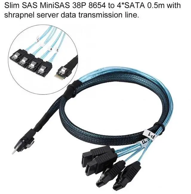 Slim Line SAS 4.0 SFF-8654 4i 38pin Host to 4 SATA 7pin Target Hard Disk Fanout Raid Cable 50cm