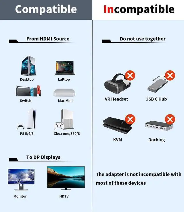 - If both your devices have in and out interfaces, please choose HDMI output and DP input. Compatible with a wide range of devices including PCs, laptops, Chromebooks, gaming consoles, Blu-ray players, and more.