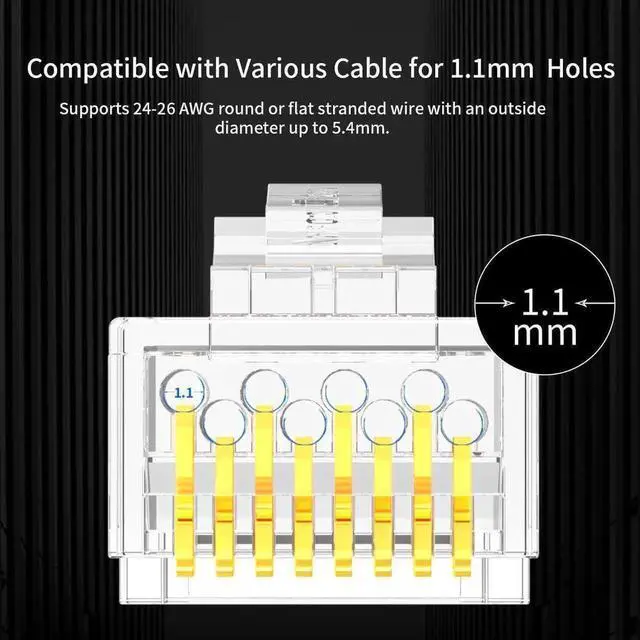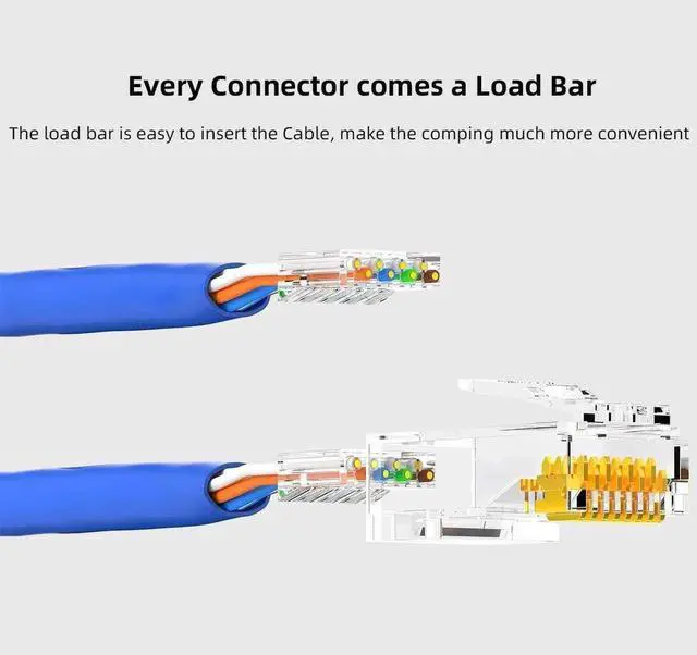 Two-Piece Design: CAT 6 RJ45 CONNECTOR terminates unshielded twisted pair cable for making a custom-length Cat 6 Ethernet cable; Supports 24-26 AWG round or flat stranded wire with an outside diameter up to 5.4 mm. Each connector with a load bar which is best for installation with RJ45 conductors
