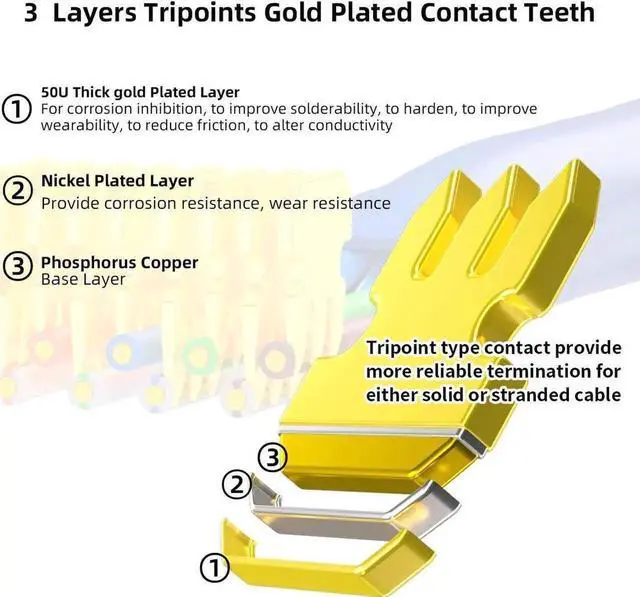 Wide Applications: 3-Prong contacts pins can straddle both solid and stranded conductors properly. Suitable for CAT6/5E/5 cables and support POE; Used for CCTV, Routers, Switches, Printers, Hubs, PC, and Servers