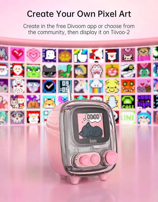 Divoom Tiivoo-2 Retro Bluetooth Speaker with FM Radio,Pixel Art Portable Mini Cute Wireless Small Speaker,Vintage Decor Suitable for Party Office Desk Home Bedroom Kitchen,Gifts for Women Men,Pink