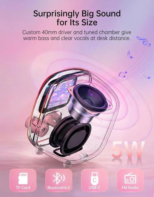 Powerful Sound QualityDelivers clear, room-filling audio with balanced bass and crisp highs. Small in size but loud enough for bedrooms, desks, and casual gatherings.