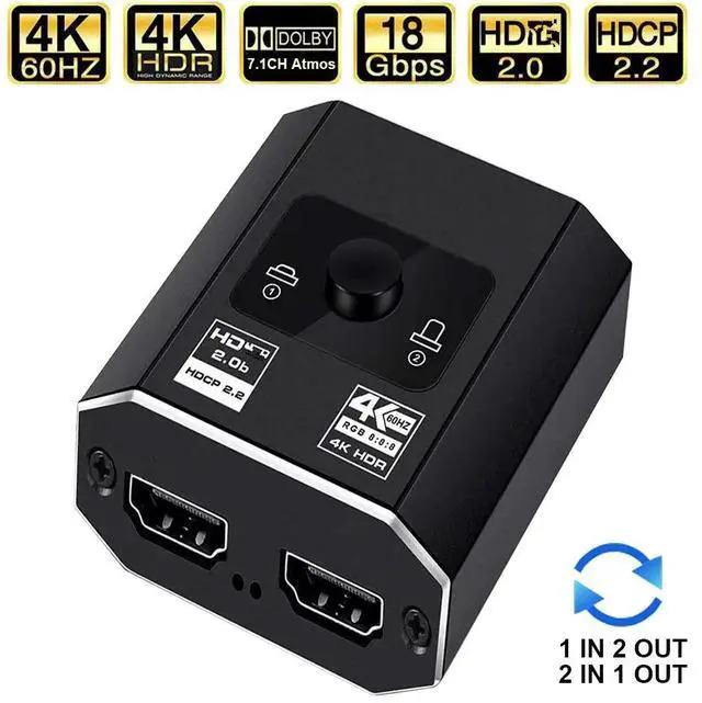 4K@60Hz 1080P@120Hz HDMI-compatible Bi-Directional Switch can connect two HD sources like blu-ray player and PS3, PS4, PS4 pro, PS5 etc, to a single HDMI display like HDTV. Besides, it also can switch one signal source to two displays(just like 1*2 splitter, but it is different that the 2 displays can not work at the same time).