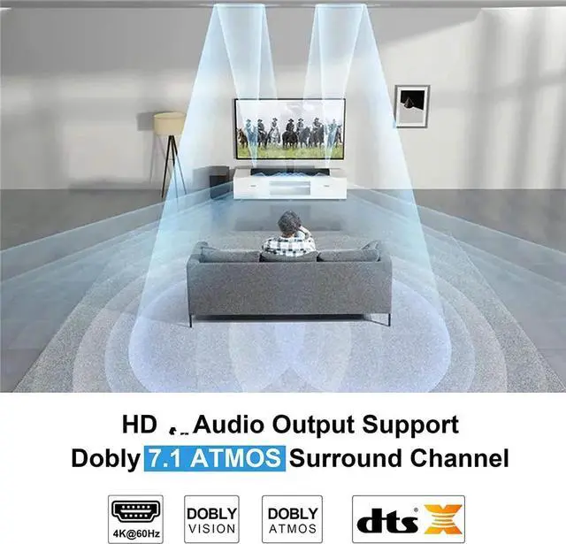 4K HD switch with High bandwidth 18.5G bps data transmission, can support 3D, 1080P@60Hz, 1080P@120Hz, 4Kx2K@60hz resolution and HD audio, Dolby Atmos.