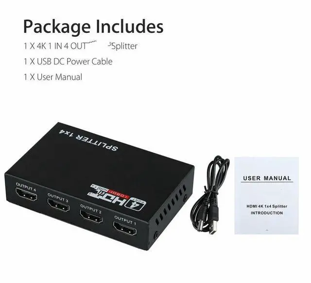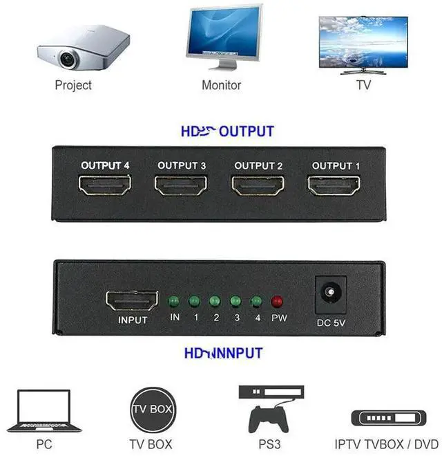 The HD splitter enables the distribution of HD signals from set-top boxes, DVD players, d-vhs players, and other HDTV devices into a 2/4-way consistent, synchronous HD signal output. Users can simultaneously connect the output signal to hd projector, DLP, LCD hd TV and other devices to display synchronously.