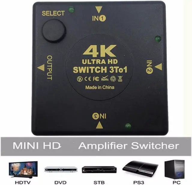This 3 input to 1 output HDMI-compatible switcher has the key-press-switching function and has the inteligent function. The 3 input to 1 output HDMI-compatible switcher routes high definition 4k*2k video and digital audio from any one of the 3 sources to display unit. Three inputs accommodate the simultaneous connection of high definition video sources, such as HD player, Blu-ray player, Set Top Box, P&S3, Xbox360 etc. The output sends the high definition audio/video signals to a high definition display like HDTV.
