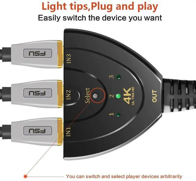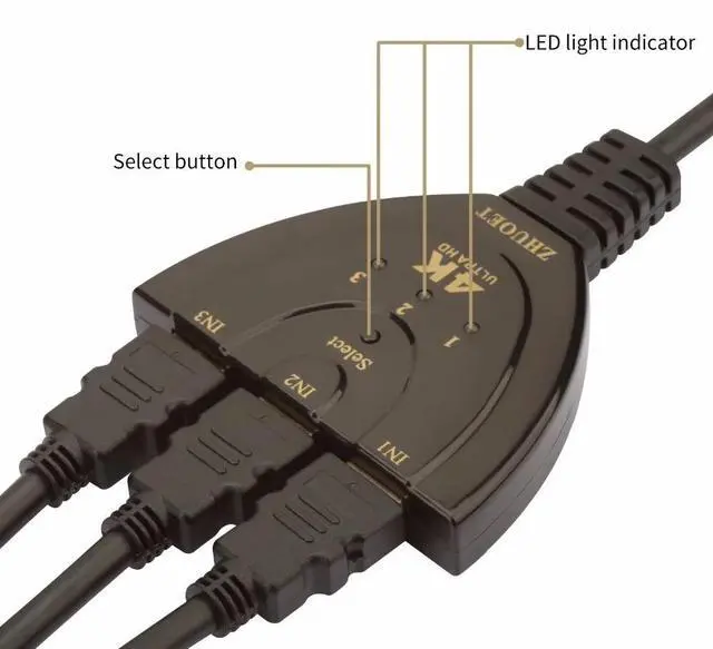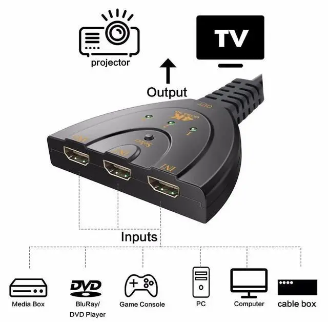This 3 input to 1 output HDMI-compatible switcher has the key-press-switching function and has the inteligent function. The 3 input to 1 output HDMI-compatible switcher routes high definition 4k*2k video and digital audio from any one of the 3 sources to display unit. Three inputs accommodate the simultaneous connection of high definition video sources, such as HD player, Blu-ray player, Set Top Box, P&S3, Xbox360 etc. The output sends the high definition audio/video signals to a high definition display like HDTV.