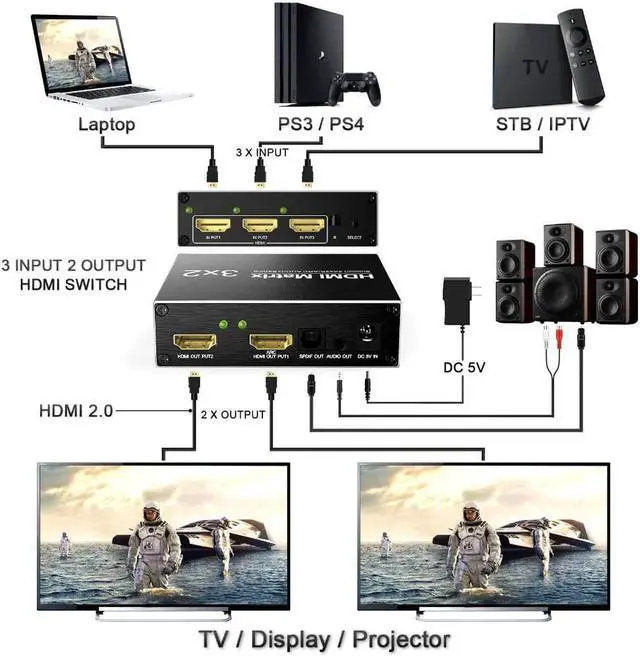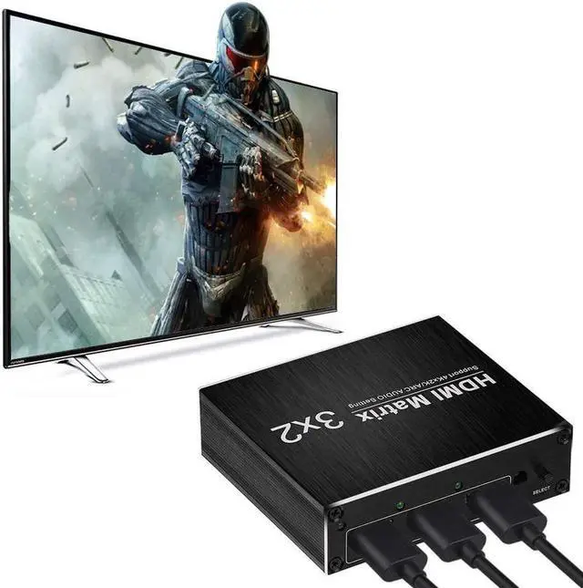 It is a 3-input and 2-output switch distributor. You can simultaneously output one image/sound of three