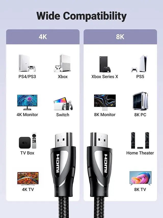 Widely CompatibilityThis 8K HDMI cord is compatible with PS5, PS4 Pro, PS3, Xbox 360, Xbox Series X, Xbox one X/S, Apple TV 4K, Roku, Nintendo Switch, Wii U, Laptop, PC, Blu-ray player, AV Receiver, TV stick, TV Box, DVD player, Soundbar, Projector, Monitor and more