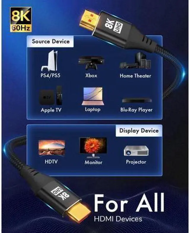 Ultimate High SpeedThis Ultra High-Speed HDMI 2.1 cable has 48Gbps of bandwidth which means it can support 8k signals at 60Hz 4k at 120Hz & 1080p at 144Hz hit all the high-end specs you need. Enter the 8K UHD WorldOur HDMI cable works with eARC Dolby Vision Dolby Atmos HDR HDCP 2.2 and more to give you the best AV setup on the block. Also backwards compatible to work with any older HDMI port or device. 4K Custom MadeGet 4k resolution at 120Hz on the Xbox Series X & PlayStation 5. Requires a TV/monitor that supports these specs.