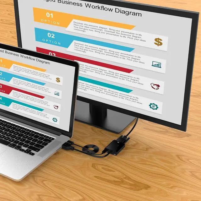 The HDMI to VGA adapter with audio provides a cost-effective and easy solution for connecting a desktop, laptop, or other devices with HDMI port to a VGA display such as monitor, projector or TV.