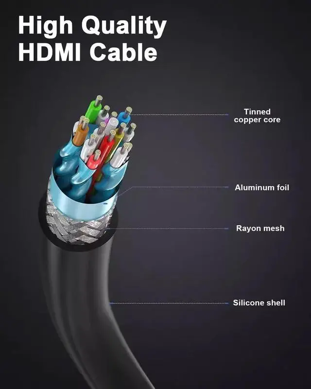 Designed for gamers and photographers: The internal structure of the Camera HDMI cable features multi-layer shielding (aluminum foil + braided mesh + grounding layer), effectively resisting electromagnetic interference from 5G/Wi-Fi/Bluetooth, ensuring stable 10K/8K signals without screen flickering. High-purity oxygen-free copper core (OFC) reduces resistance and enhances transmission efficiency, making it suitable for long-distance (over 3m) lossless transmission.