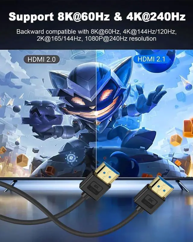 Ultra High Speed HDMI cable: This ultra-thin and flexible 8K HDMI to HDMI cable supports a bandwidth of 48Gbps, enabling smooth transmission of 8K@60Hz, 4K@120Hz/144Hz, and even future 10K resolutions (for some professional devices), as well as 3D, Ethernet, Audio Return Channel (ARC), HDR, and high-resolution audio formats. It is also backward compatible with 2K@165/144Hz and 1080P@240Hz.