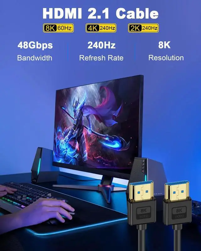 Ultra High Speed HDMI cable: This ultra-thin and flexible 8K HDMI to HDMI cable supports a bandwidth of 48Gbps, enabling smooth transmission of 8K@60Hz, 4K@120Hz/144Hz, and even future 10K resolutions (for some professional devices), as well as 3D, Ethernet, Audio Return Channel (ARC), HDR, and high-resolution audio formats. It is also backward compatible with 2K@165/144Hz and 1080P@240Hz.