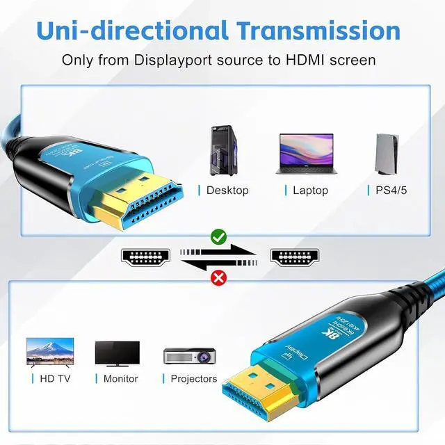 UPDATED 100 Ft Fiber Optic HDMI 2.1 Cables 8K 48Gbps Metal armored protection, metal armored tube + outer TPE jacket Flexible and durable, suitable for indoor and outdoor use. 8K Ultra High Speed HDMI Cable, 48Gbps, 8K@60Hz 4K@120Hz Active HDMI to HDMI cable male to male port, from the "source" to "display ", please check the direction before use. Suitable for all HDMI devices - Blu-ray players, PC, HDTV, laptop, monitor, monitors, projector or large display.