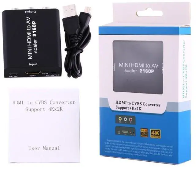 1. This is a HDMI to CVBS signal converter, which can convert HDMI digital signal to AV (CVBS) composite video signal and L / R stereo audio signals to help users convert the high quality of the HDMI video signal into normal CVBS signal so that can play on the TV with CVBS interface. 2. It support NTSC and PAL two TV format and support HDMI input resolution up to 4Kx2K/30Hz.