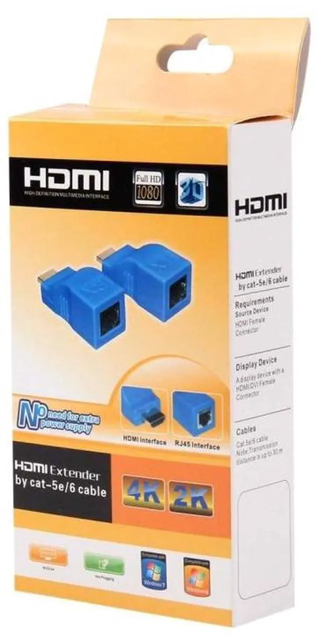 This kind of HDMI Extender by CAT-5e/6 cables use only one of CAT-5e/6 cables to extend the HDTV display up to 30 meters for 1080p, This Adapter not only breaks the limitation of the HDMI cable transmission length, but also has more flexibility and convenience in cable construction.