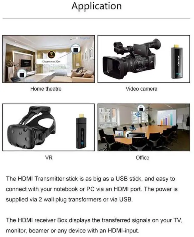 • Thetransmittercanbeconnectedtolaptops,DVDs,TVBOXset-topboxes,suitableforPS4gameconsoles,cameras,karaokemachinesandothersignalsources;thereceivercanbeconnectedtoprojectorsorTVsorLEDlargescreens,di