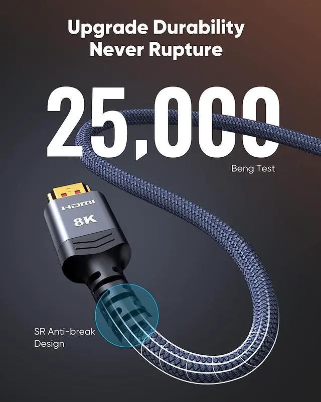 This 8K HDMI Cable uses Highwings' most popular classic style, with a new smart chip, making it reach an unprecedented height. The strength of the aluminum alloy shell and the tail's anti-bending design has been upgraded to make it more durable. The plug part is still made of 24K gold-plated material, which accurately transmits signals. The military grade tensile nylon material also greatly extends its life.