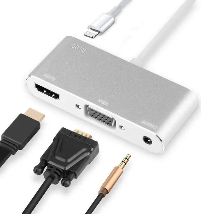 2.Connect lightning port to your iPhone/iPad, HDMI or VGA interface to HDMI or VGA equipped display.