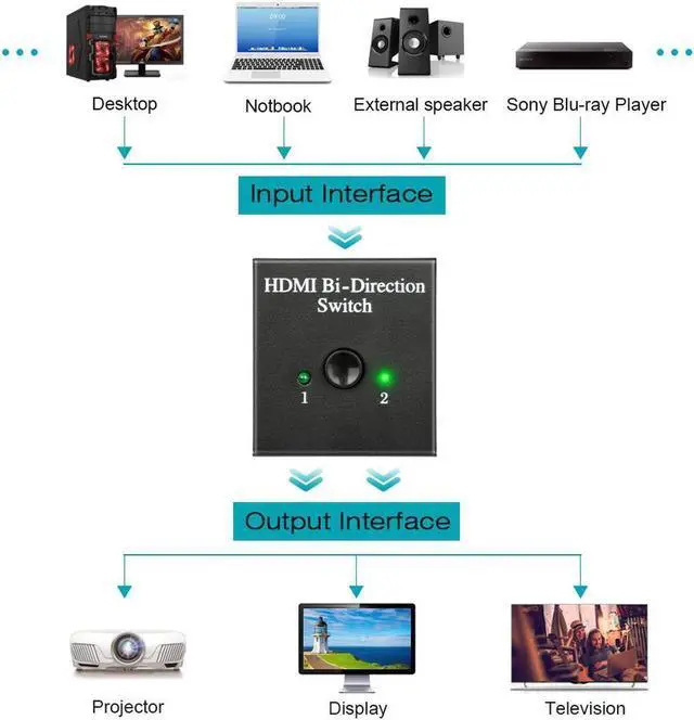 • hdmi switch 1 Input 2 Output: Connect 1 HDMI source to 2 displays, toggle between 2 display devices. (only one output device will display for each time)