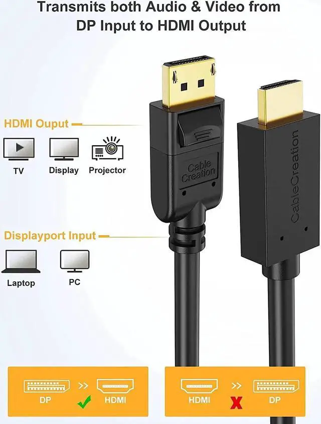 Note: This cable is uni-directional, it can only transfer signal from DisplayPort PC/laptop/graphics card to HDMI monitors. It will not work if your video source is HDMI and monitor is with DisplayPort input.