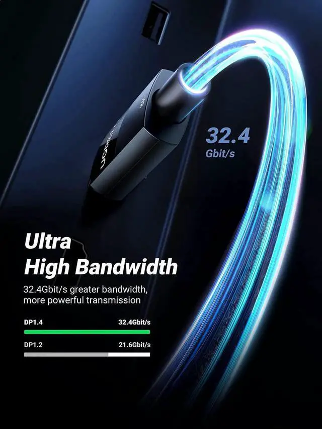 DisplayPort 1.4 Cable supports transmission speed up to 32.4G bps Bandwidth, resolution up to 7680x4320, refresh rate up to 8K@60Hz, 4K@144Hz, 2K@165Hz. UGREEN 8K DP Cable meets VESA Standard and supports Dynamic HDR and HDCP 2.2. Backward compatible with DisplayPort 1.3 / 1.2.