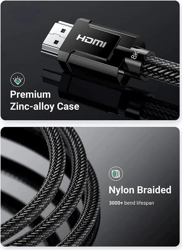 Durable HDMI 2.1 certified cable: UGREEN HDMI 2.1 cable is HDMI 2.1 certified, with a certification code attached to the package, which can be checked. This 8K HDMI cable is tougher than any other braid cable since it has armor nylon and all-metal port has longer service life and will never rupture.