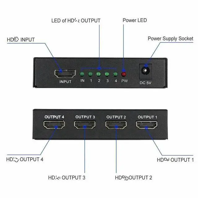 The HD splitter enables the distribution of HD signals from set-top boxes, DVD players, d-vhs players, and other HDTV devices into a 2/4-way consistent, synchronous HD signal output. Users can simultaneously connect the output signal to hd projector, DLP, LCD hd TV and other devices to display synchronously.