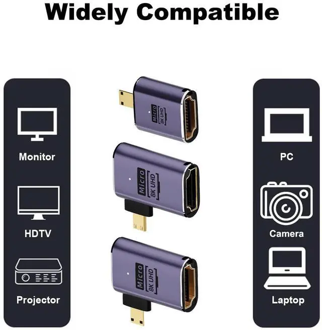 90 Degree Angle DesignThis micro HDMI to HDMI adapter with left and right angle allows the HDMI cable to have a suitable extension direction, which can avoid the wear of the HDMI cable and the input port of the device, prolong the service life.