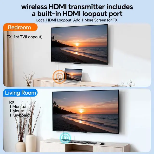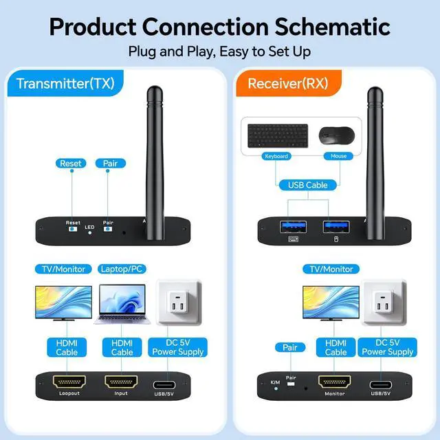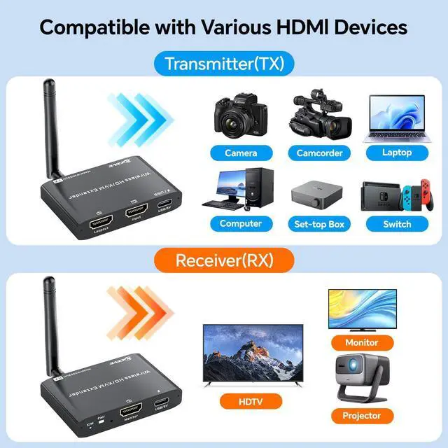 - [Wide Compatibility]The Wireless HDMI transmitter and receiver is plug-and-play,requiring no software drivers.compatible with most HDMI-equipped devices like PCs,TVs,monitors DSLRs,AV receivers,projectors,laptops, Blu-ray,cameras,set-top boxes,DVRs,and more lIt is widely applied for enterprise,office,home entertainment, business meetings,church projection,classroom teaching,digital signage,security monitoring,and live broadcasting,etc
