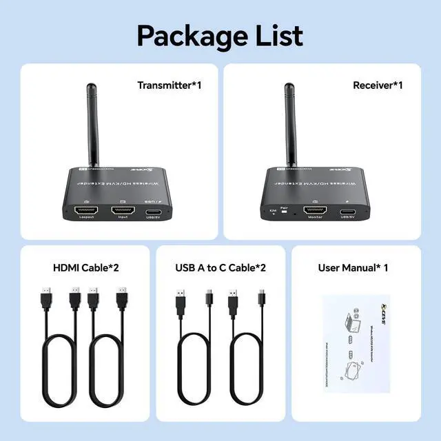 - [What You Get ]1x Wireless HDMI Transmitter,1x HDMI Wireless Receiver,2x HDMI Cables,2x USB Data & Power Cables,2x External Antenna,1xUser Manual, provide a one-year wa--rranty service.If you have any questions about Wireless HDMI & USB KVM Transmitter and Receiver,please contact us,we will reply you within 24 hours