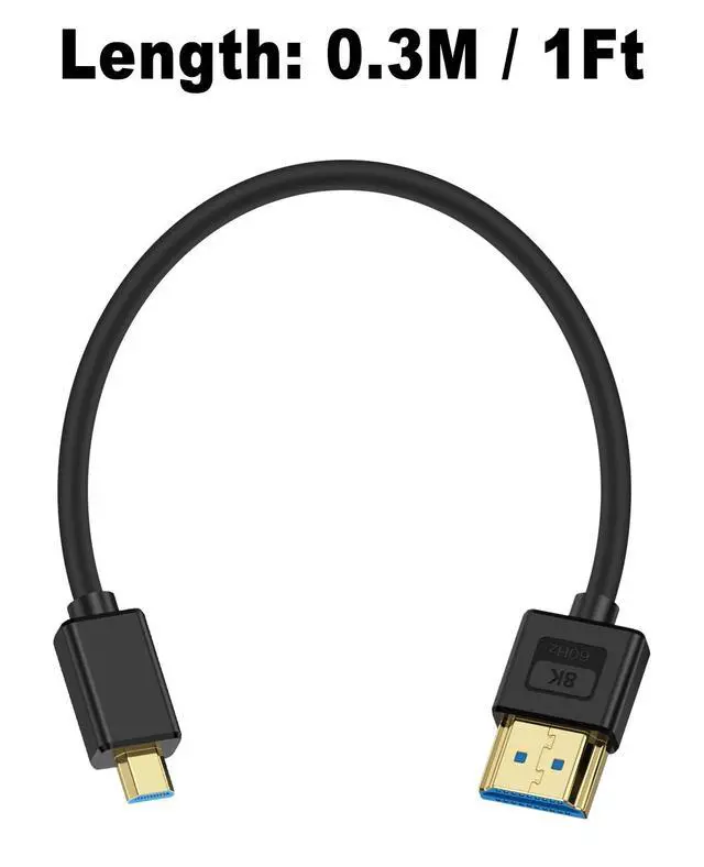 Ultra Thin 8K Micro HDMI to HDMI CableThe Silicone Micro HDMI to HDMI Cable is 0.3M and softer and more comfortable. It is made of the silicone material, and easy bending makes it more convenient to pack up and take photos/videos out. Ideal for Professional Camera Operators for use on camera rigs.