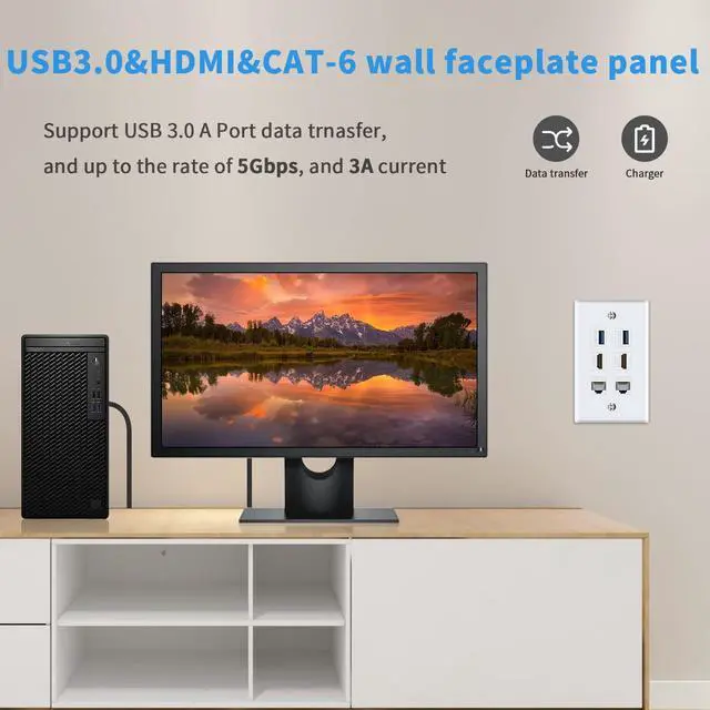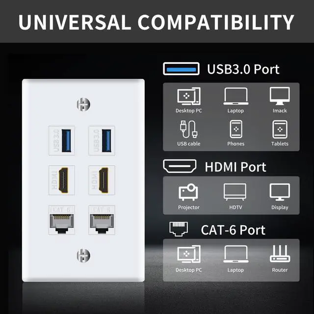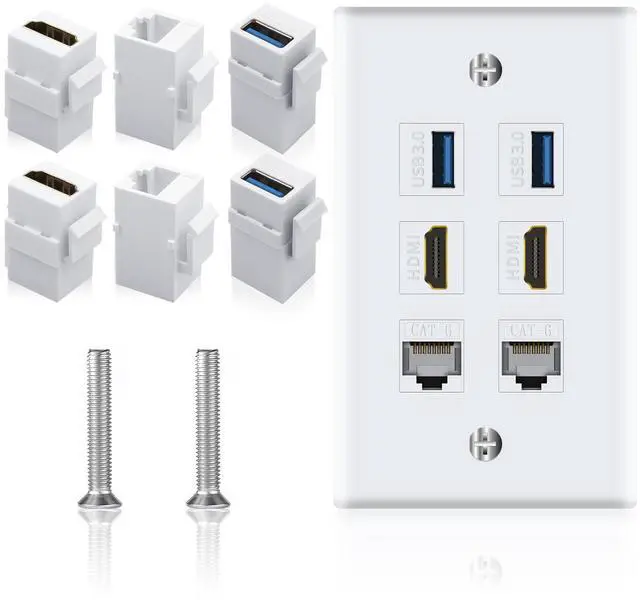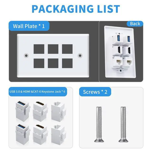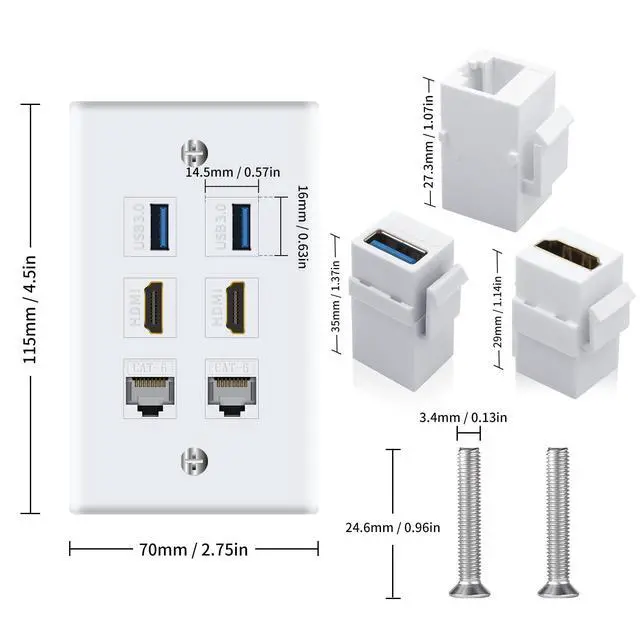 Ethernet HDMI USB Wall Plate: Include 2 x HDMI Female to Female Kestone Jack + 2 x Cat6 Keystone Jack + 2 x USB 3.0 Keystone Jack +2 x wallplate screws. Size: 70*115mm.