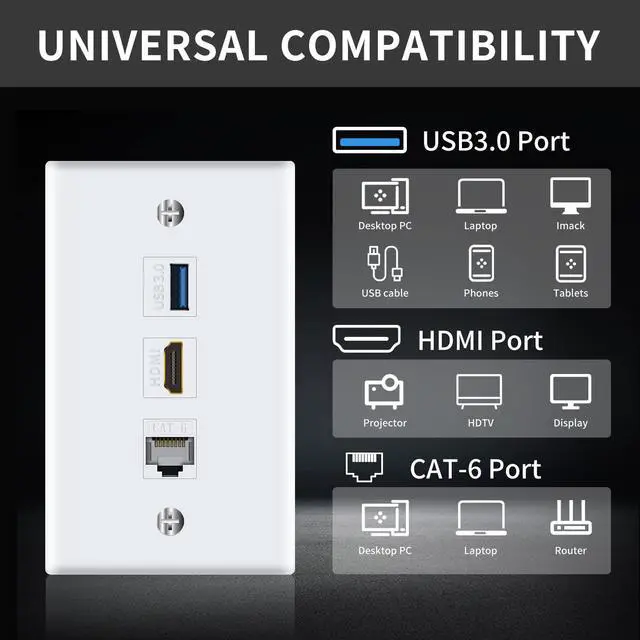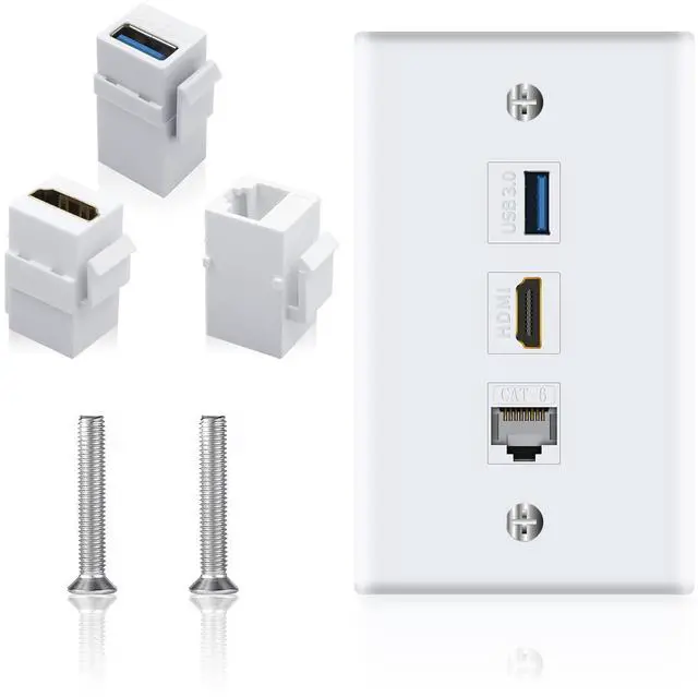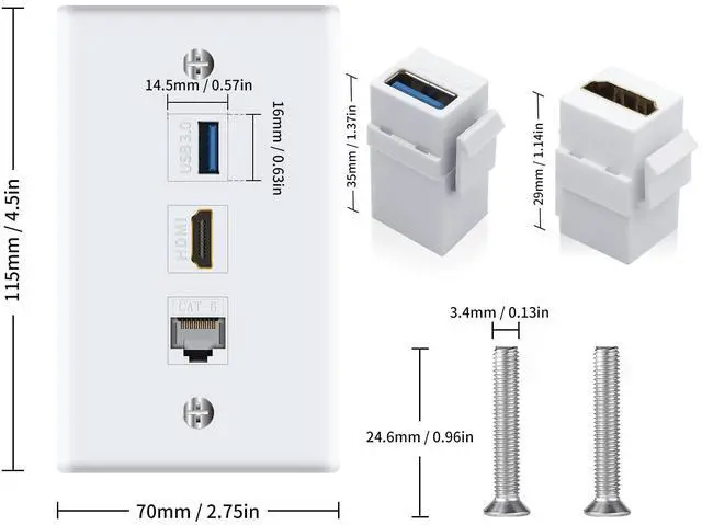 Ethernet HDMI USB Wall Plate: Include 1 x HDMI Female to Female Kestone Jack + 1 x Cat6 Keystone Jack + 1 x USB 3.0 Keystone Jack +2 x wallplate screws. Size: 70*115mm.